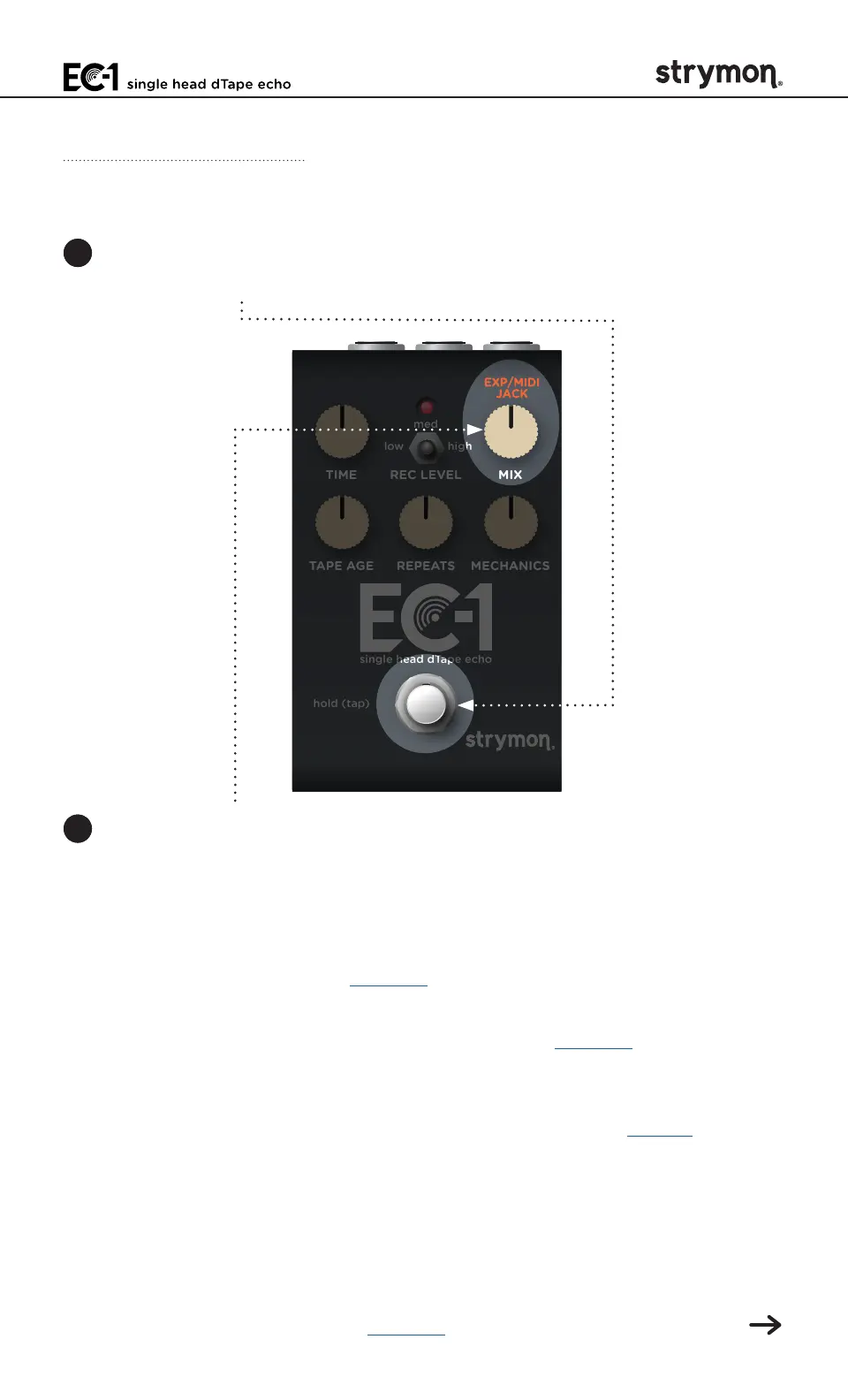 • Tap Mode: RED (12 o’clock) - Using a Strymon MiniSwitch, allows