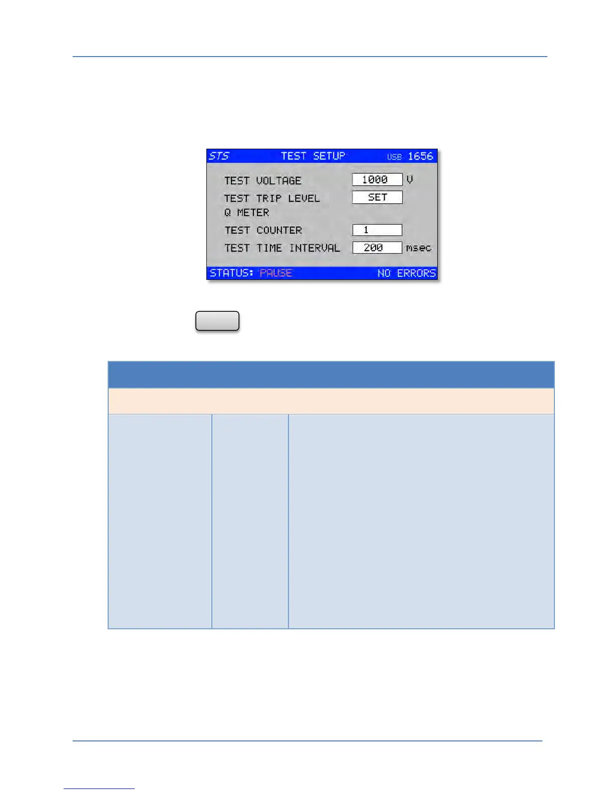 The Test Setup menu is used to program the 9 pre-stored test level and trip level settings for the