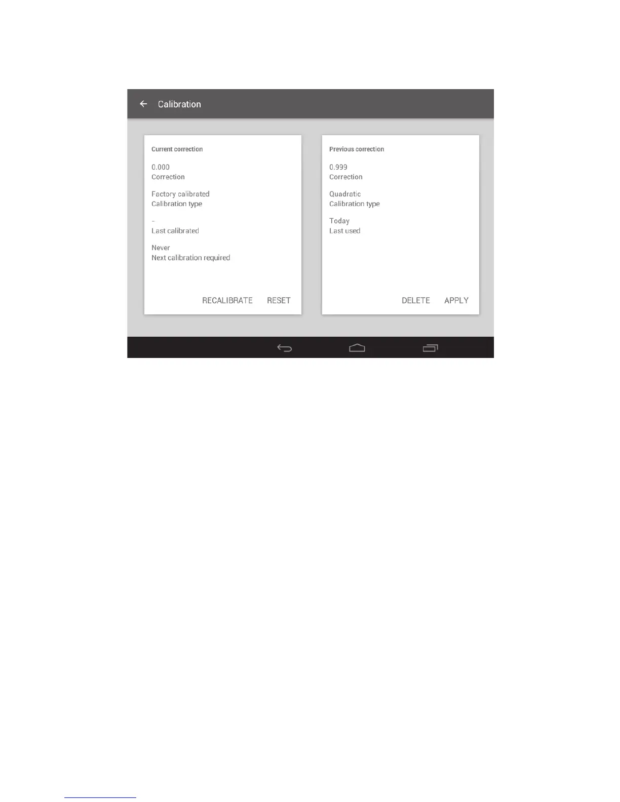 and previous correction details shown. Any previous user calibration can be re-applied by touching