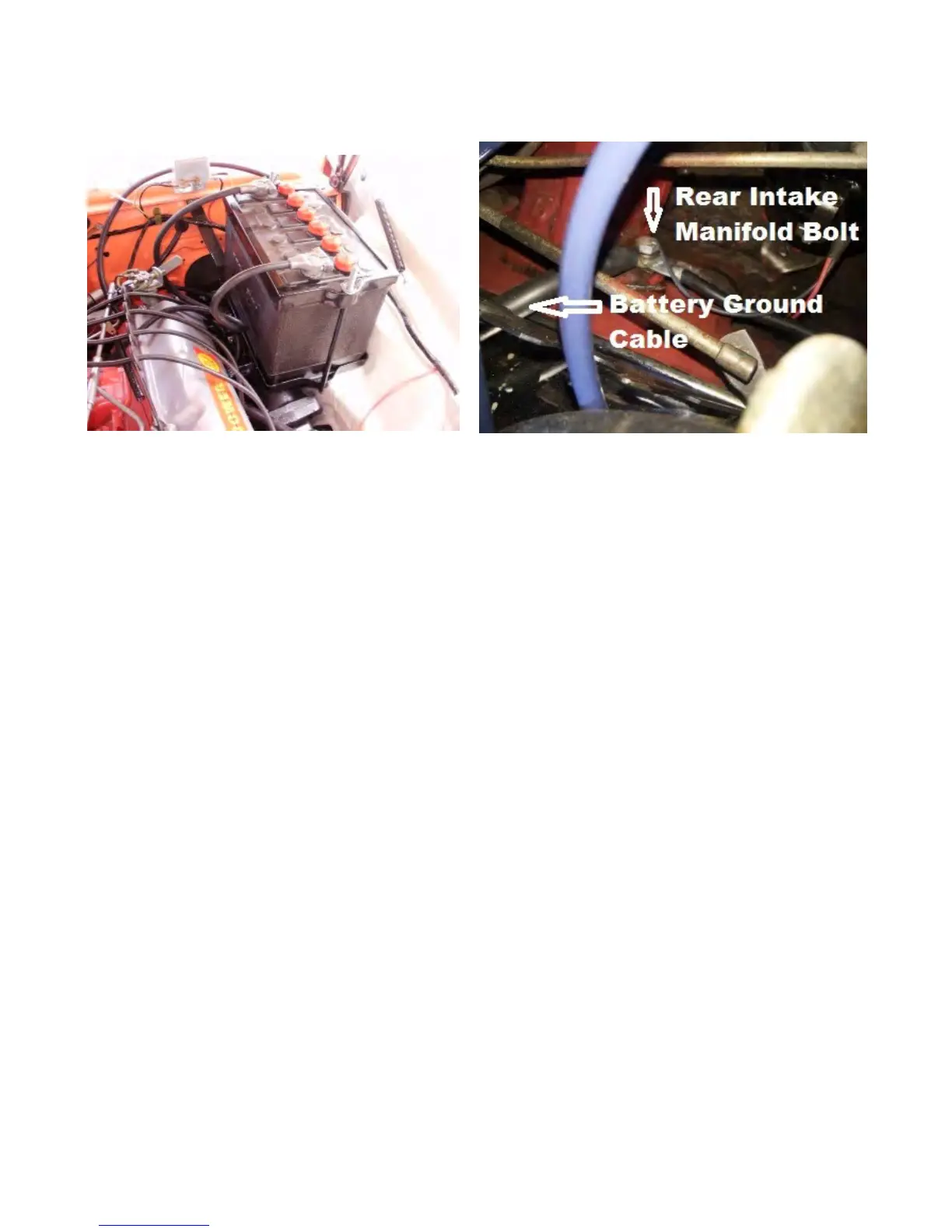 The battery ground cable runs from the negative side of the battery to the rear bolt of the intake