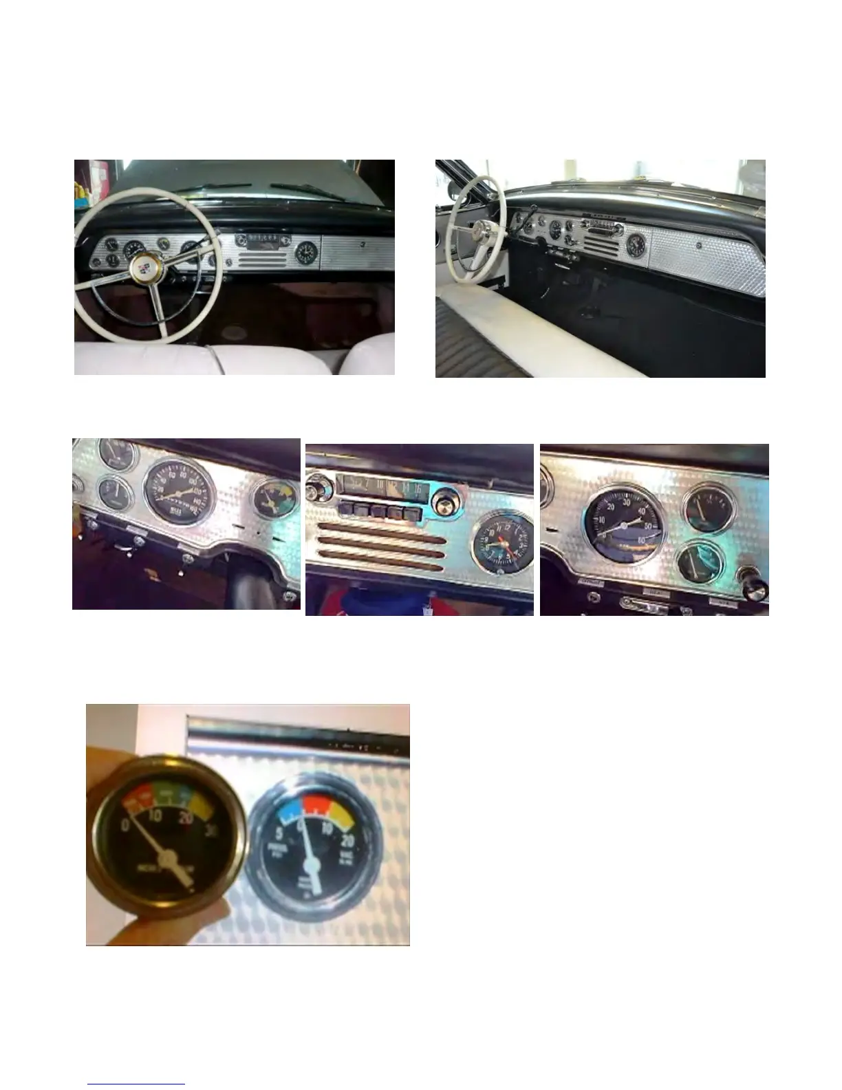 The Stewart Warner gauges are black with white letters and numerals with the exception of the