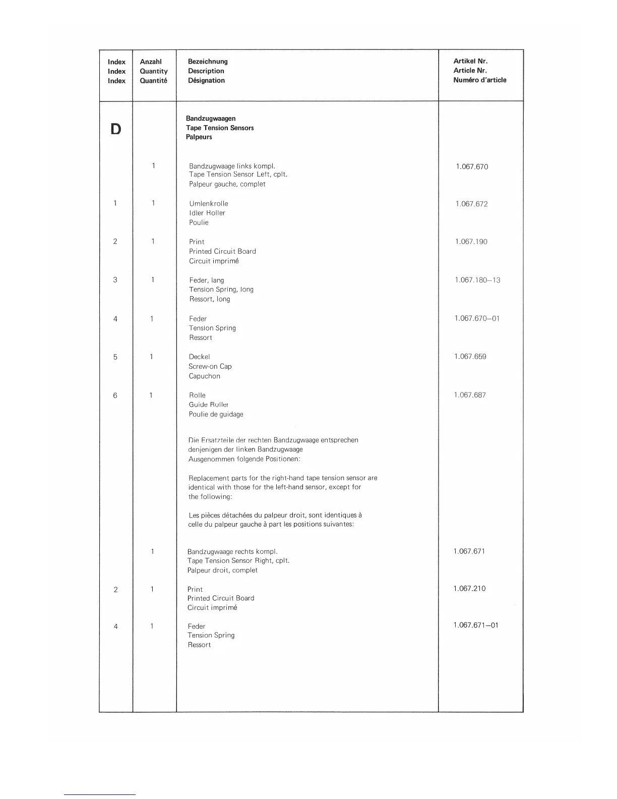 Studer A 67 - Tape Tension Sensor Parts; Left Tape Tension Sensor Assembly; Left Sensor Components; Right Tape Tension Sensor Assembly