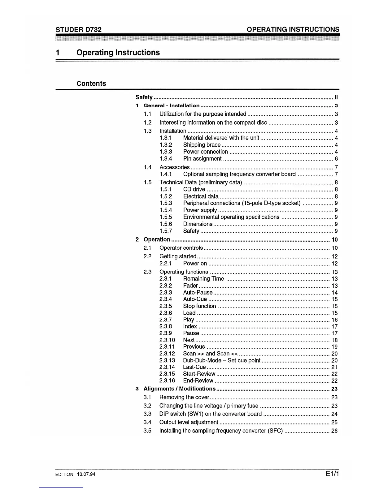 Studer D732 - Operating Instructions; Contents