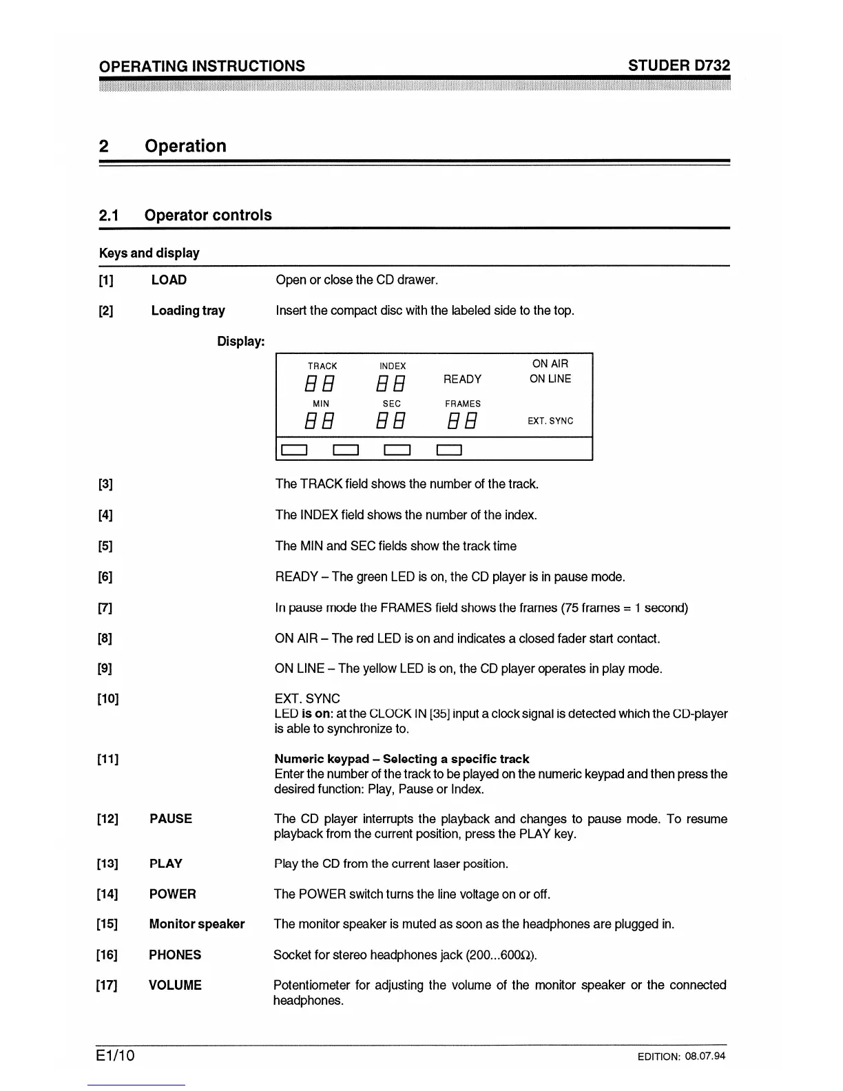 Studer D732 - Operation; Operator Controls