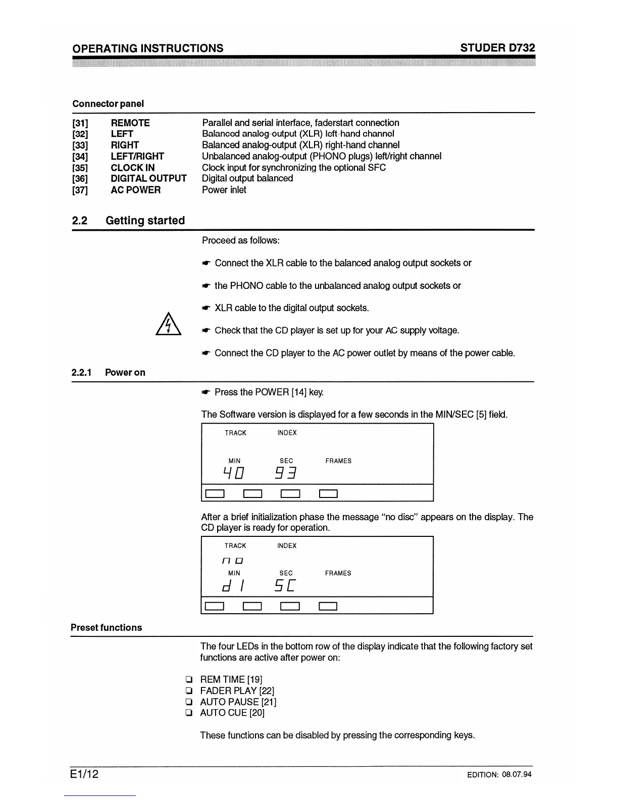 Studer D732 - Getting Started; Connector Panel; Power on; Preset Functions