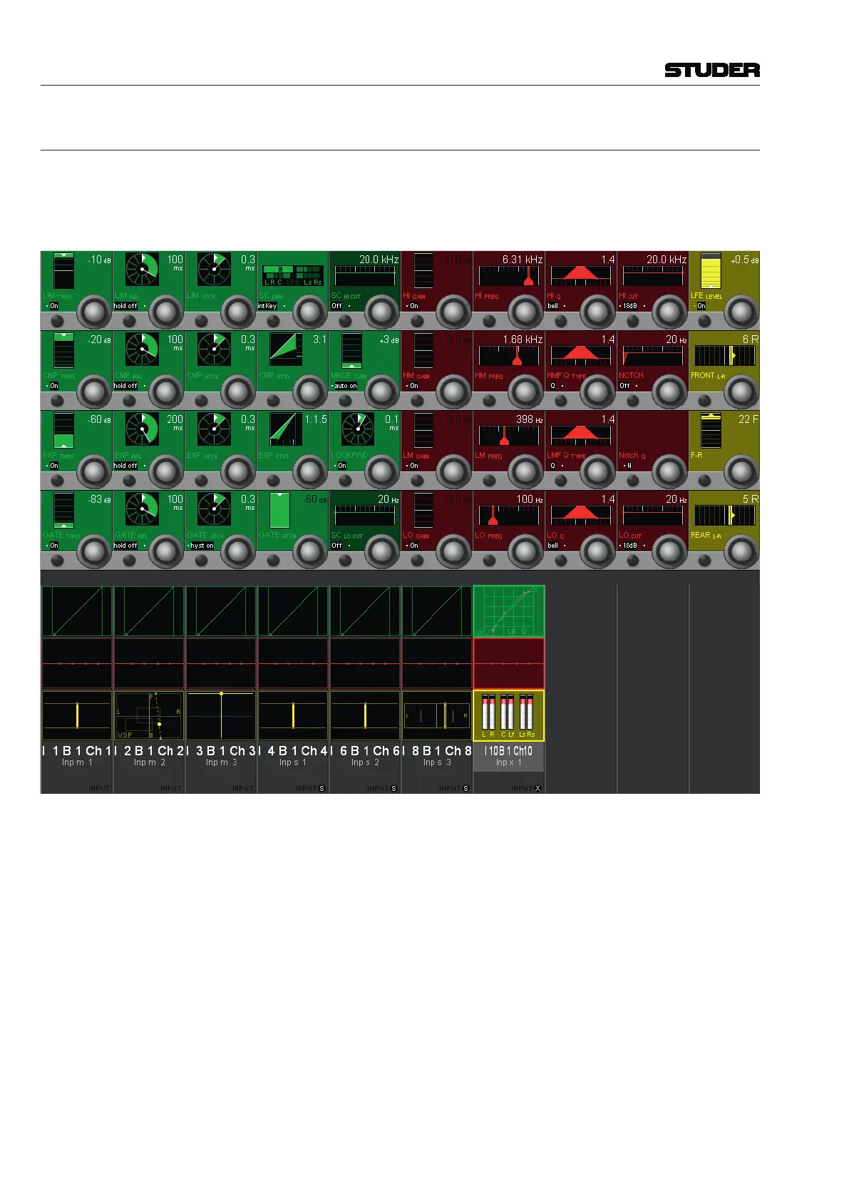 parameters of a channel’s dynamics, EQ, and pan sections are shown in the