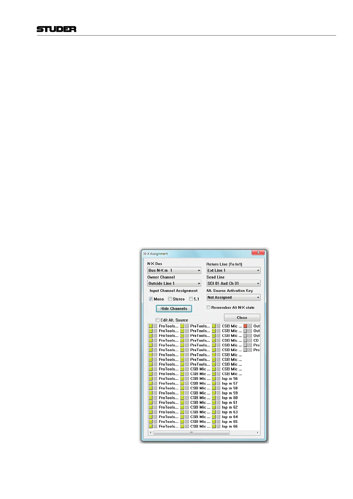 half-lit N–X owner channels, and add the AUX master channel as a further