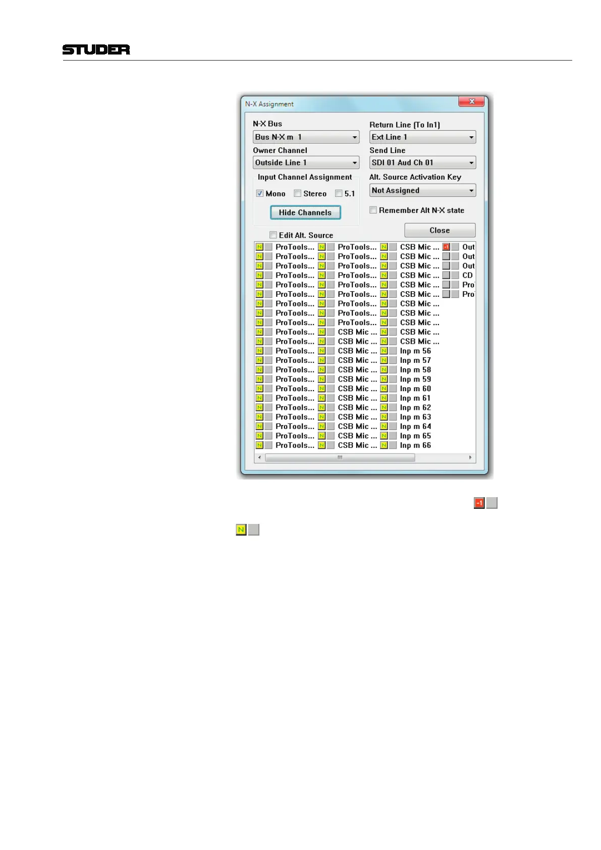 Outside Line 1), any assigned channels to the bus are shown in the list as
