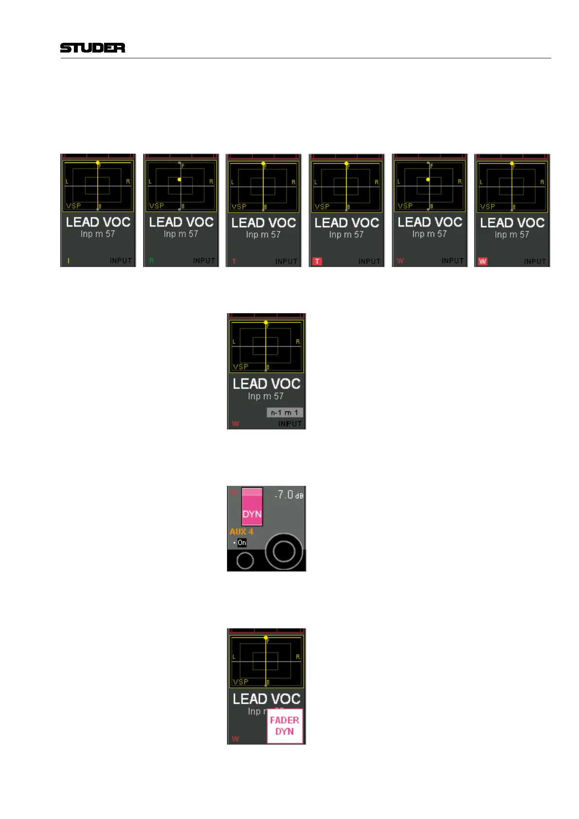 Characters without a frame indicate the status of the fader (I = Isolate, R =