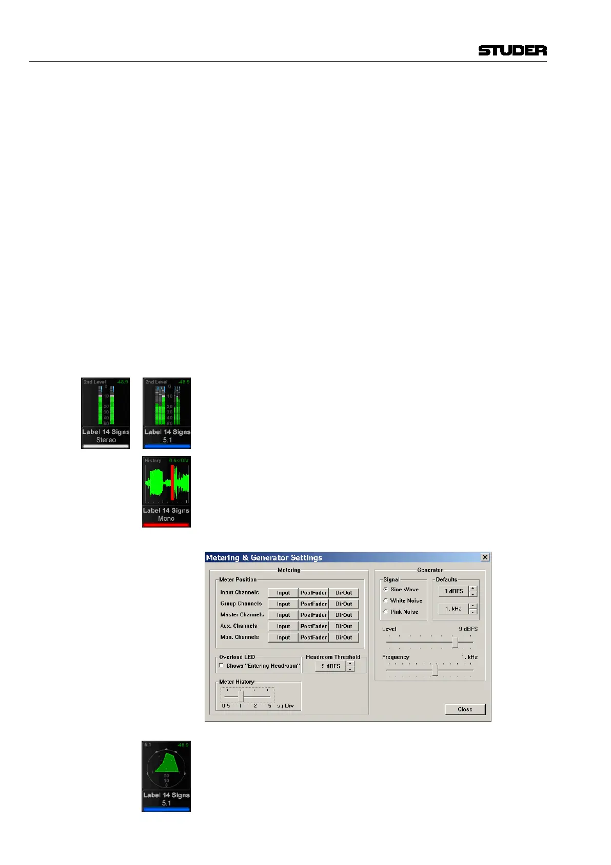 mono, stereo and surround channels and different views in the lower area –