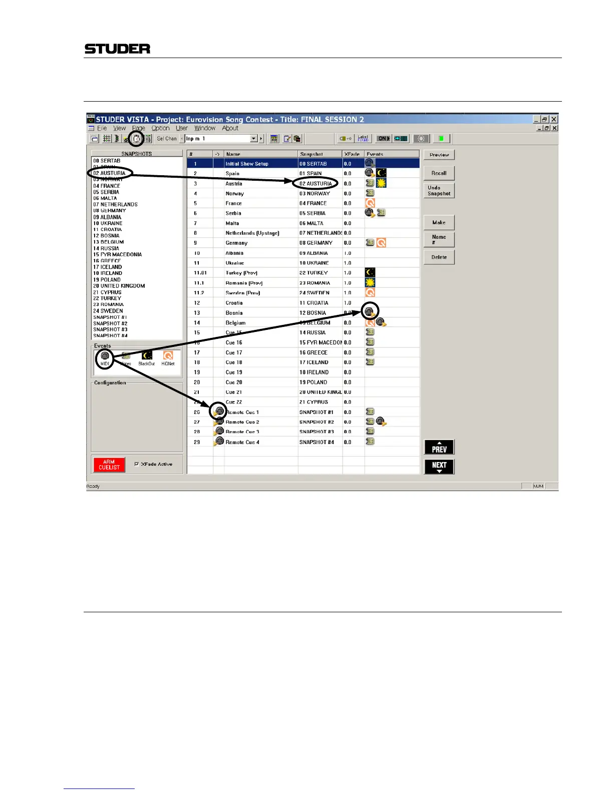 • If the cue list is armed: Attach an incoming MIDI event to it and send the