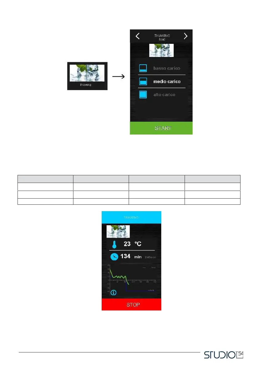 The operator may indicate three levels of thawing load. Based on the selected level, the blast chiller will start