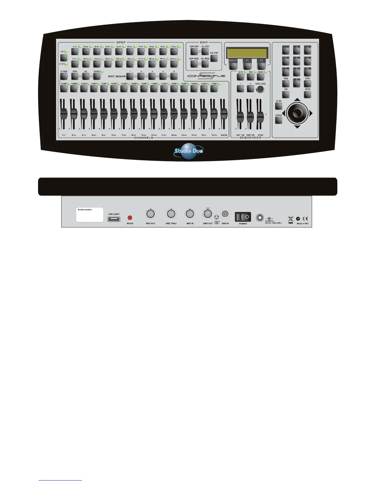 - The controller can be synchronized with an external device by MIDI IN, DMX IN or MUSIC IN