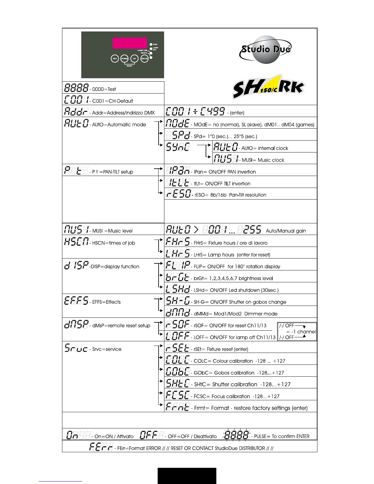 STUDIO DUE SHARK 150 - Control Panel Functions; Mode and Setup Functions; Effect and Calibration Functions