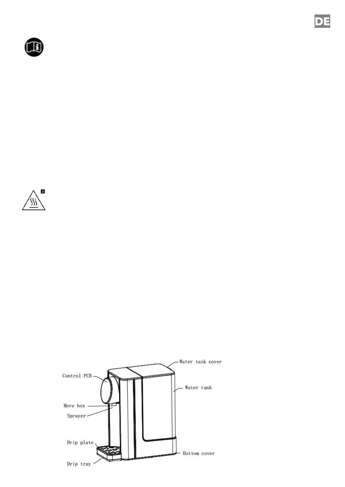 • Vorsicht! Das abgegebene Wasser ist heiß. Berühren Sie es nicht, um Verbrennungen zu vermeiden.