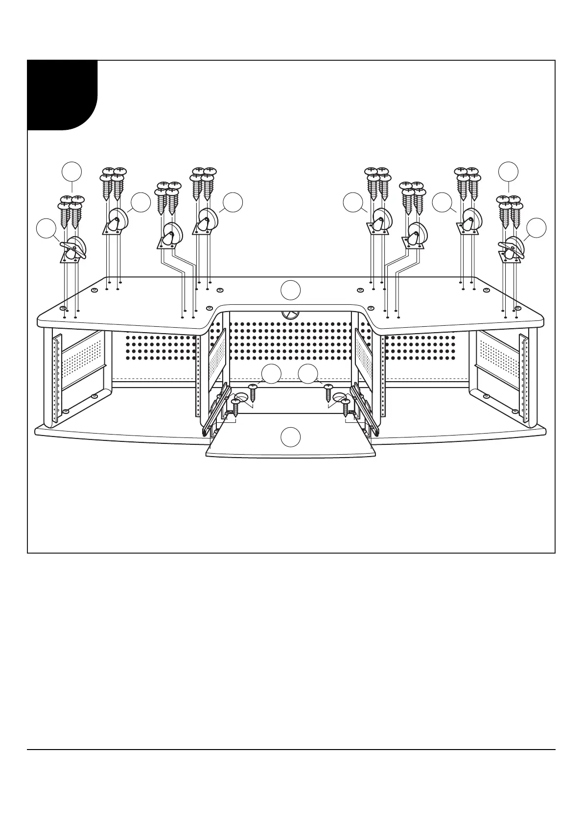 1. Attachez Roulettes avec Frein (17) au coins avant de L'étagère Inférieure (2) à l’aide des Vis Cruciformes (26).