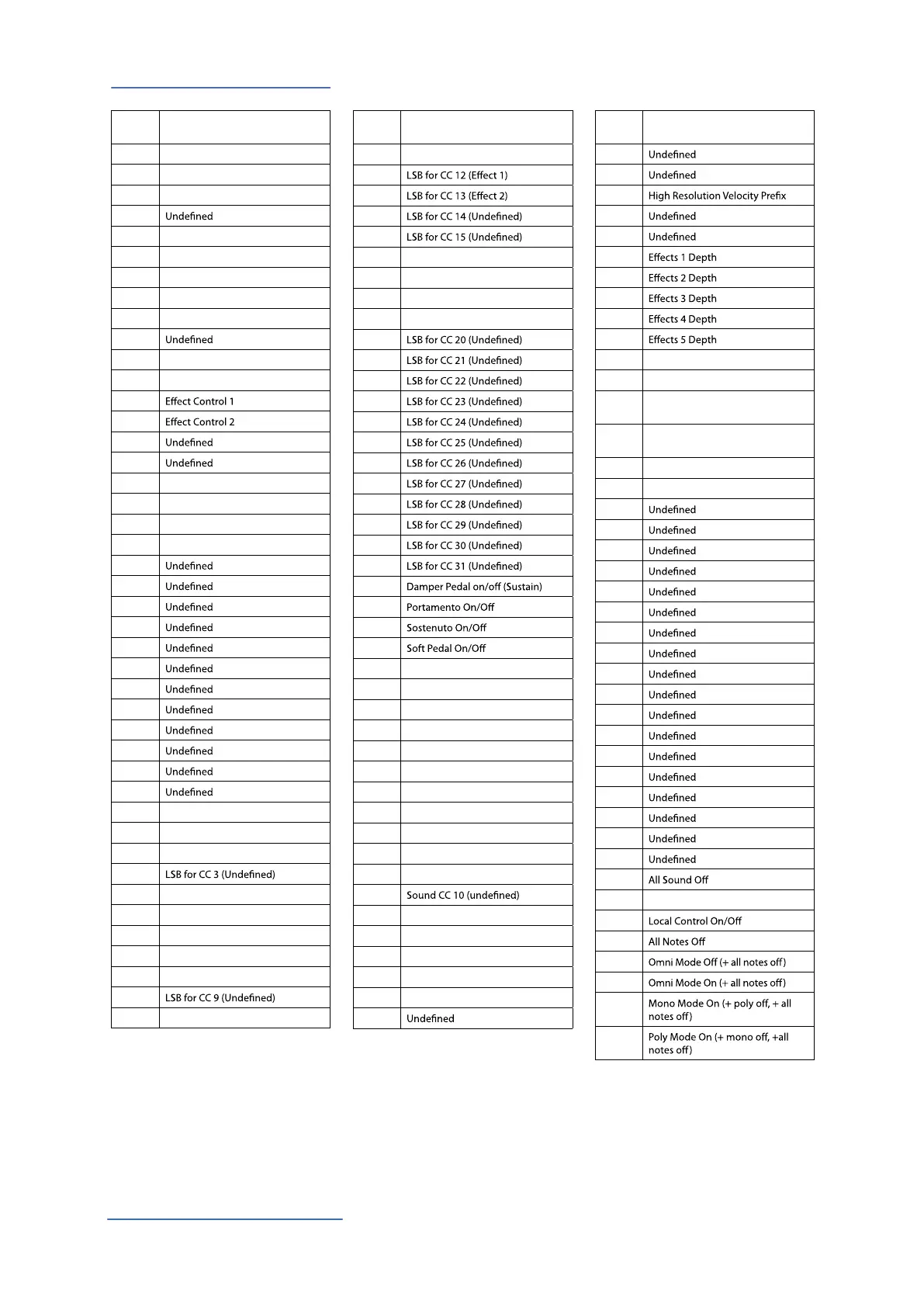 Please note: 120부터 127까지의 MIDI CC는 채널 모드 메세지이며 MIDI 표준의 사운드 컨트롤에 대해서는