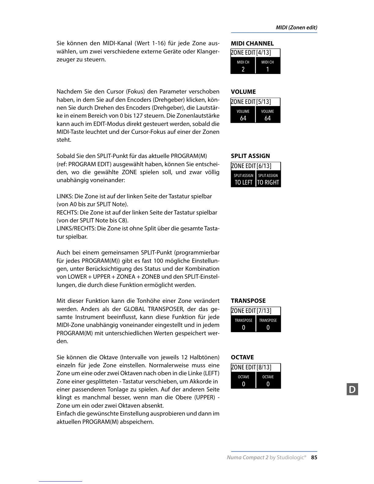 MIDI-Zone unabhängig voneinander eingestellt und in jedem
