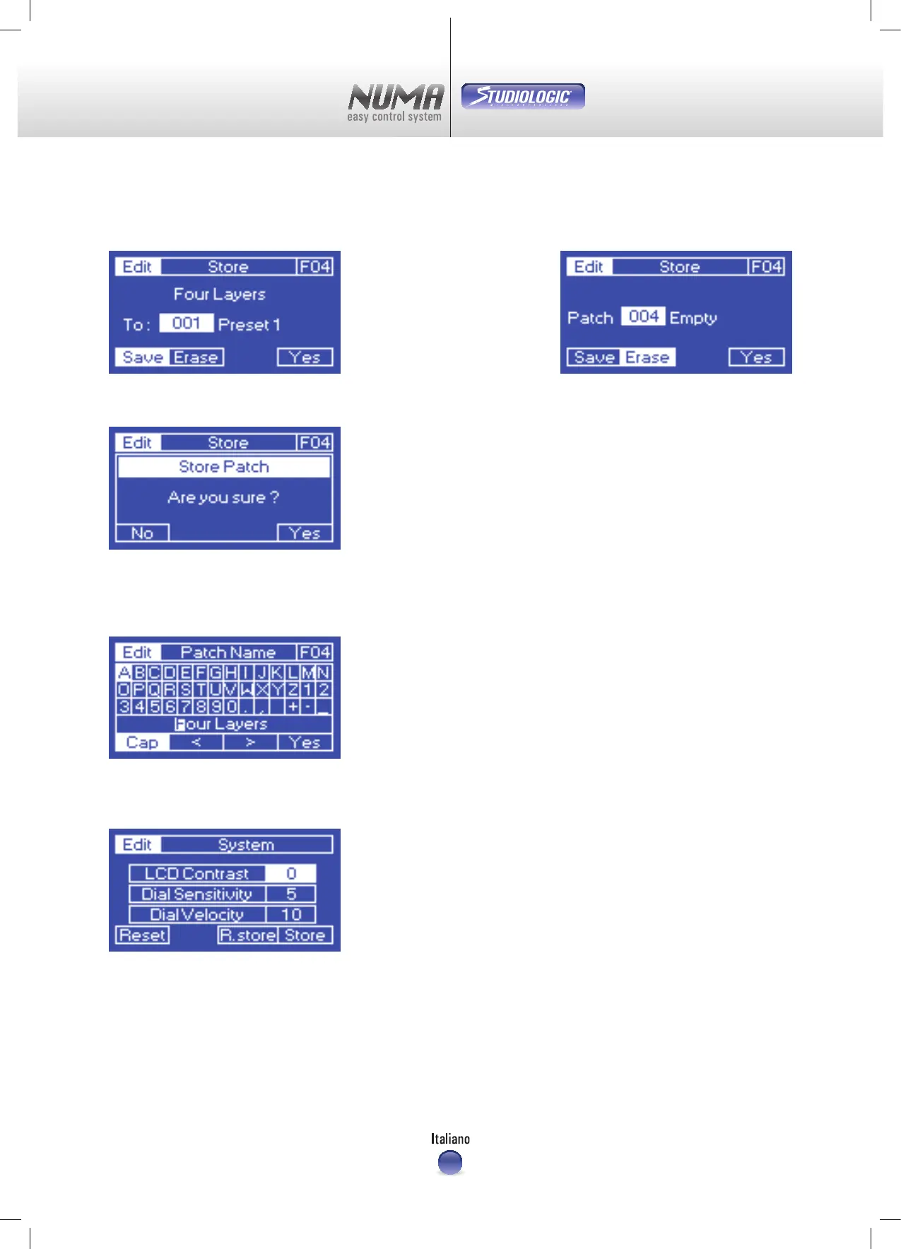 Edit t Store Page è la pagina che consente il save e l’ erase della Current Edit Patch, i valori vanno da 0 a 64.