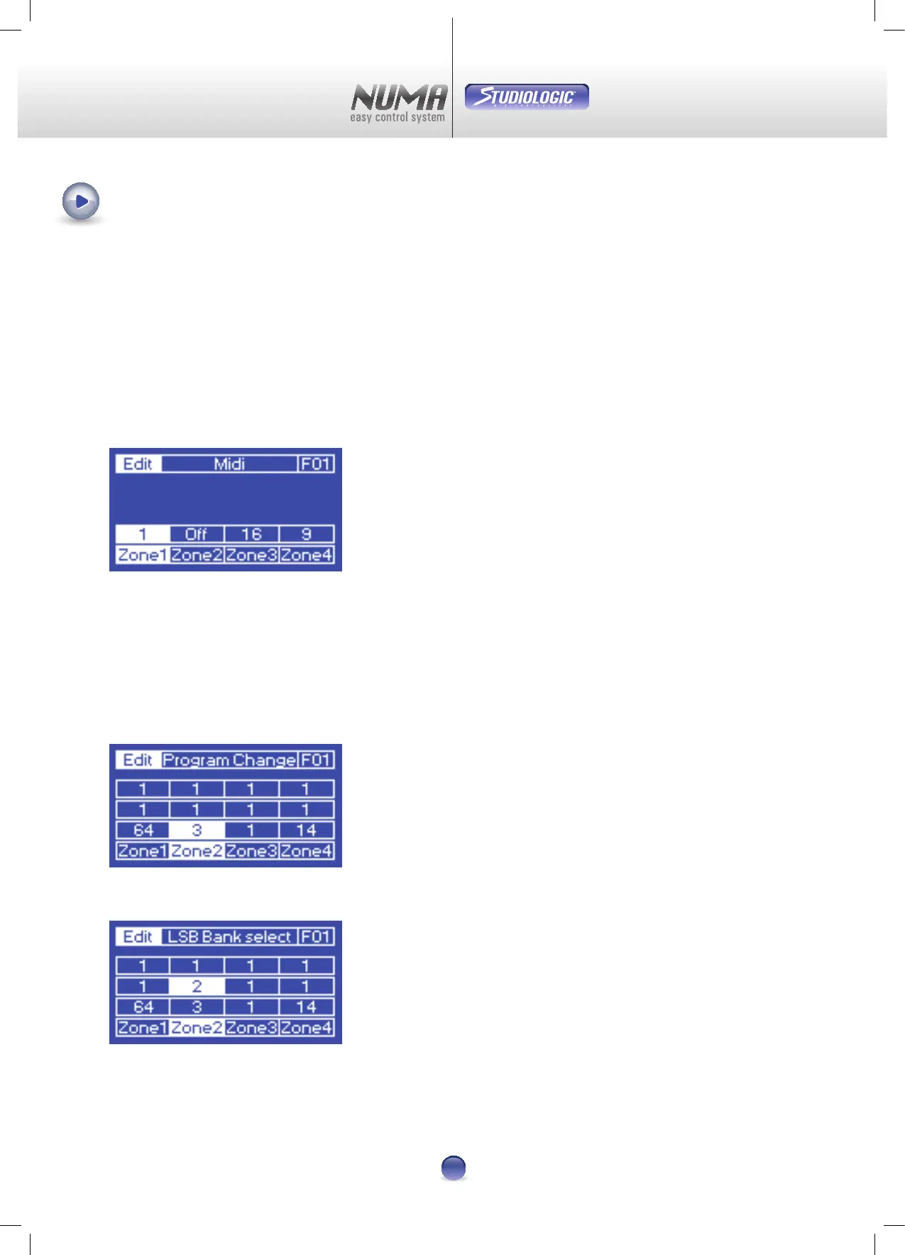 Program Change/LSB Bank select/MSB Bank select est une page répartie sur 3 sous-pages qui permettent avec
