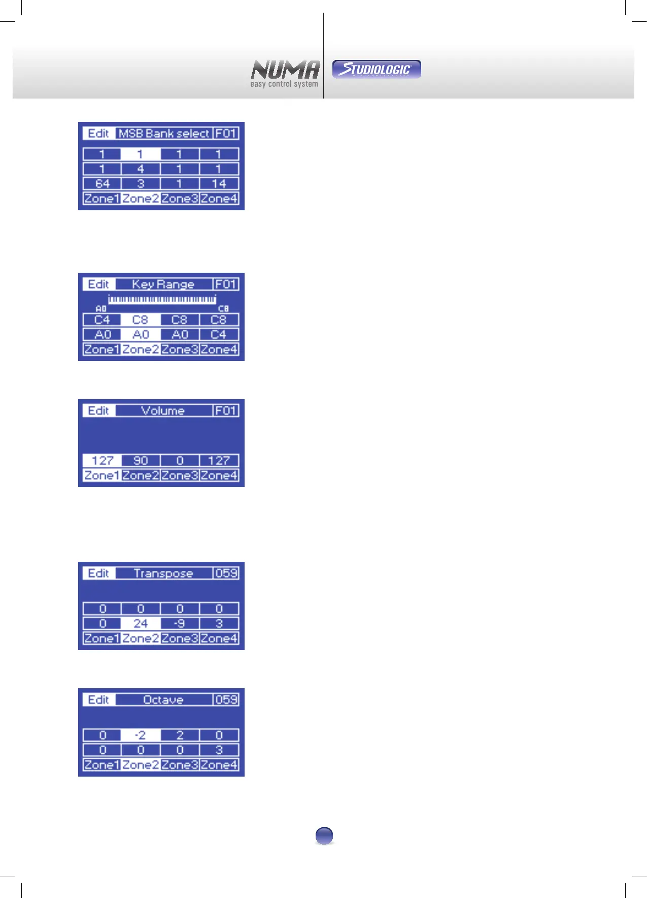 la transposition et de la hauteur d’octave de chaque Zone. La sélection des 2 sous-pages se fait par avec les èches