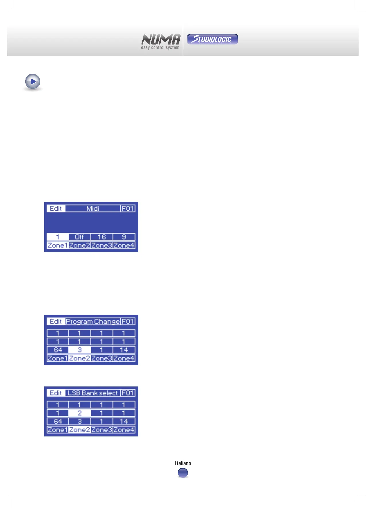 impostazione per ogni Zone attraverso la Dial rispettivamente del Program change, LSB Bank select, MSB Bank select,
