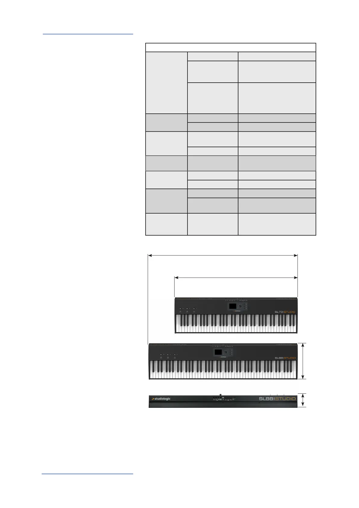 Studiologic SL73 STUDIO - Specifications and Dimensions; Studiologic SL Specifications