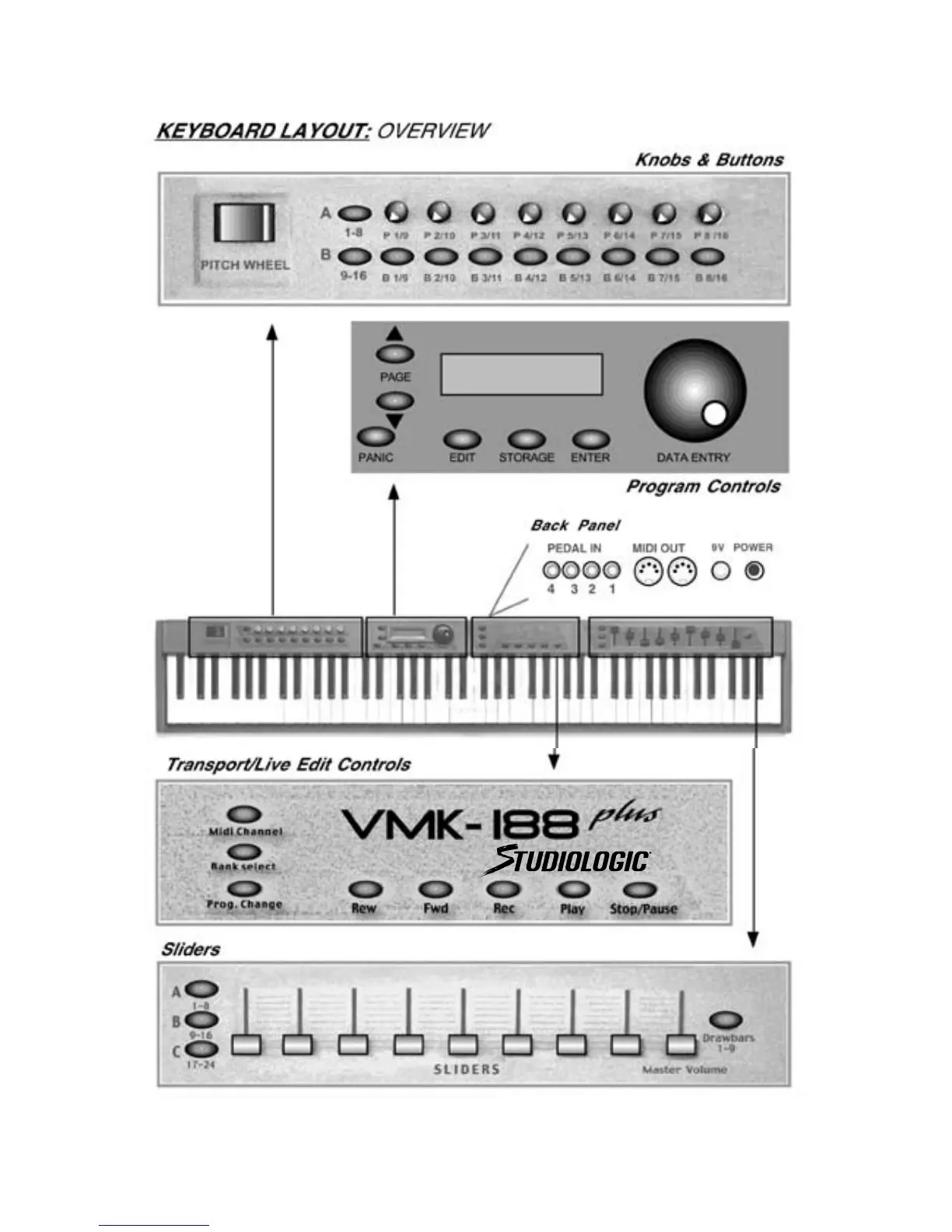 Studiologic VMK-88 plus - Keyboard Layout; Knobs and Buttons Overview; Program Controls Overview; Back Panel and Connectivity Overview