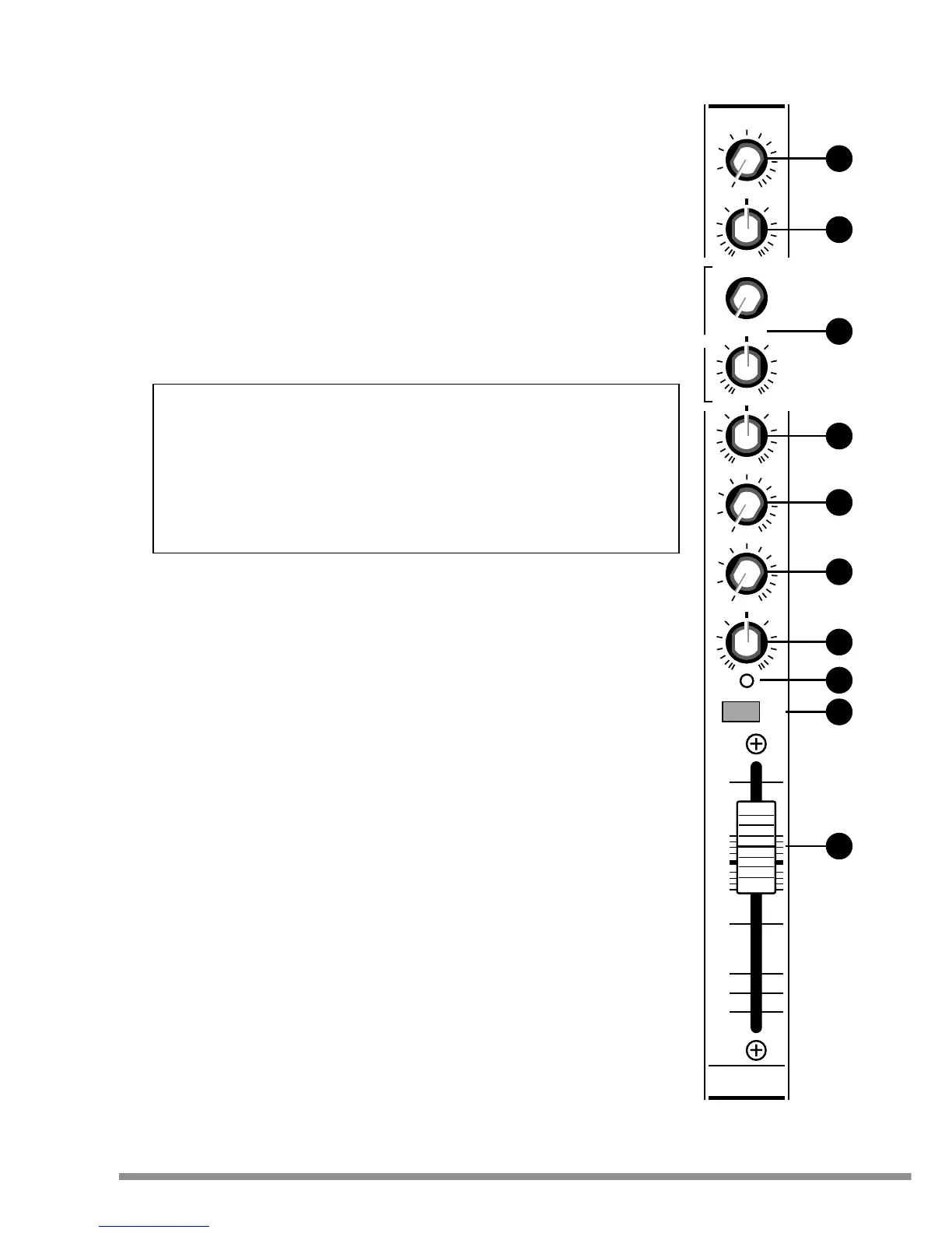 9 PFL : Depressing the PFL (pre fade listen) button allows the selected channel (or