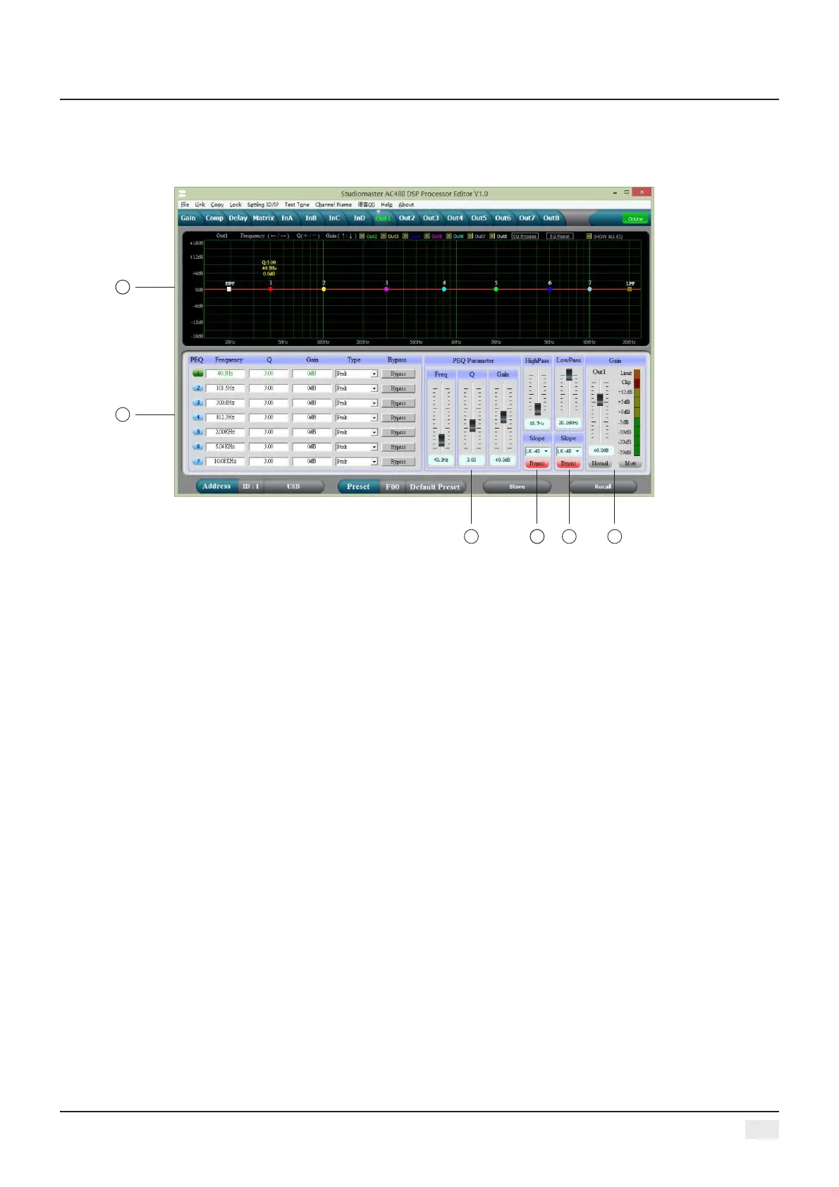 1, Display the current channel PEQ curve graph, can change each PEQ point frequency and gain