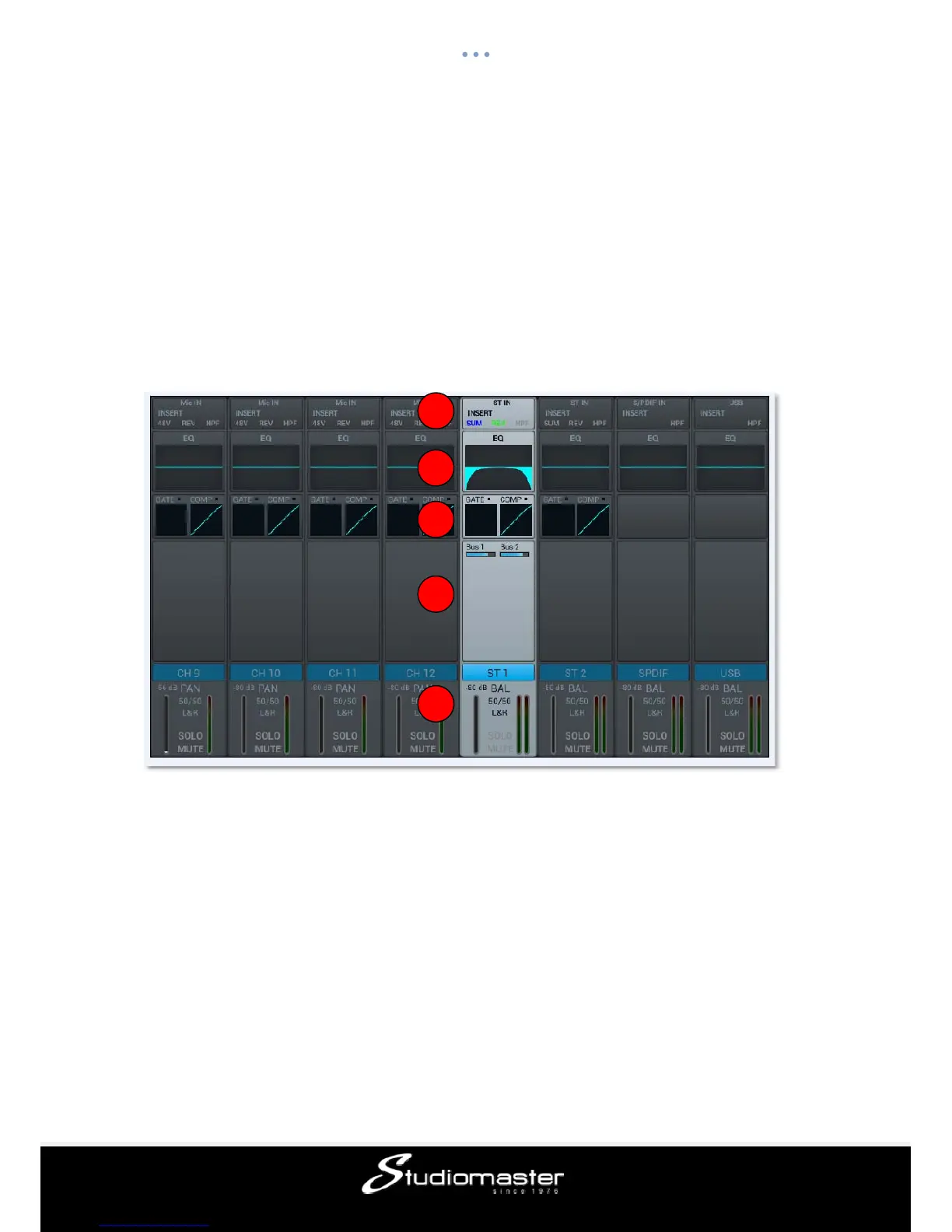 Like the MIC channels, the two stereo inputs also include five modules: Input, EQ,