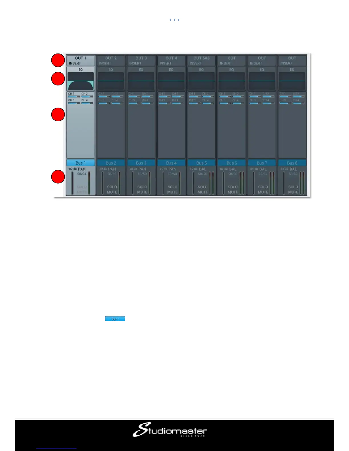 For the mono busses 1-4 this page allows to setup send level, panning and type (Pre-/Post-