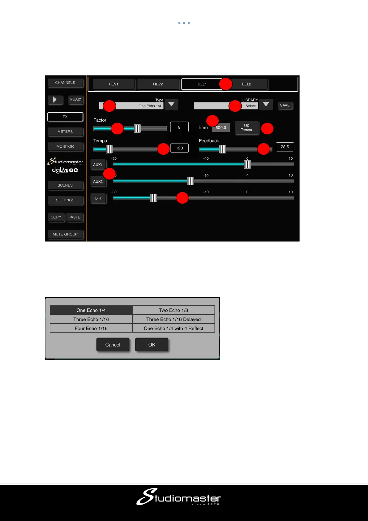 Touch the “DEL1 or DEL2” button in the FX Sub-page to access the Delay Sub-Page.