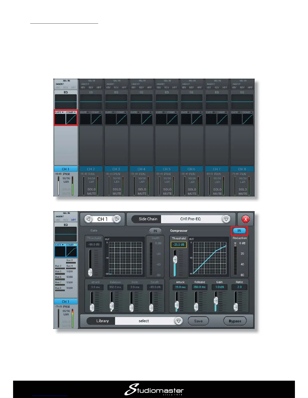 To access the dynamics controls for any channel, touch the dynamics area of its channel strip to