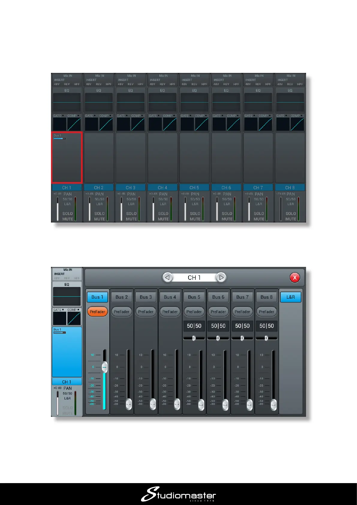 output on. Once on, a small blue “Bus 1” bar appears in the send section of the channel indicating