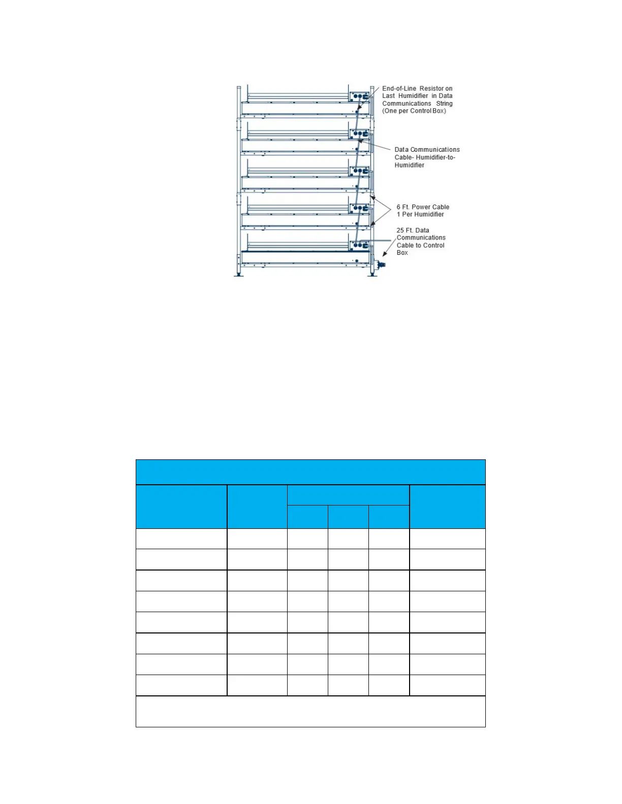 below lists the correct wire sizing from the Control Box to the Ultrasonic humidifiers for various models.