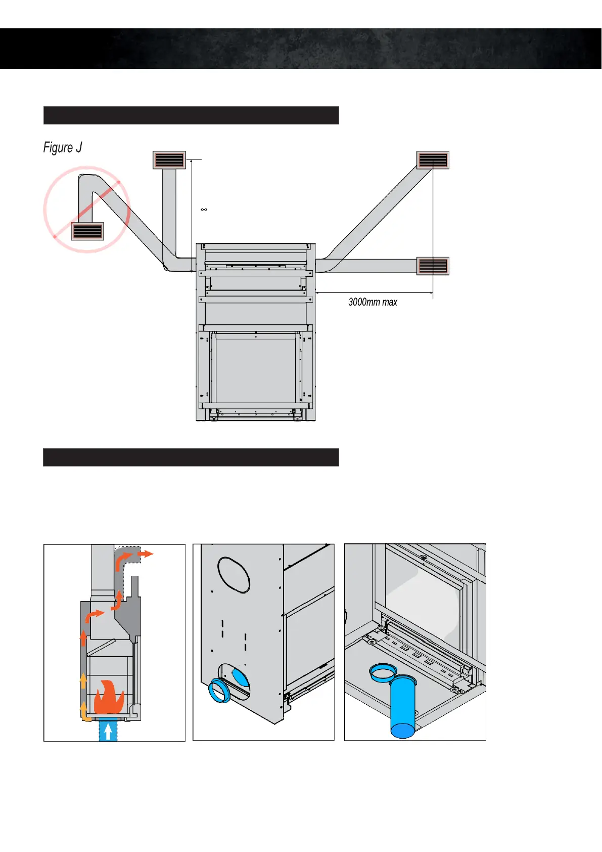 The air circulates around the combustion chamber, gets hot and goes out through convection grates in