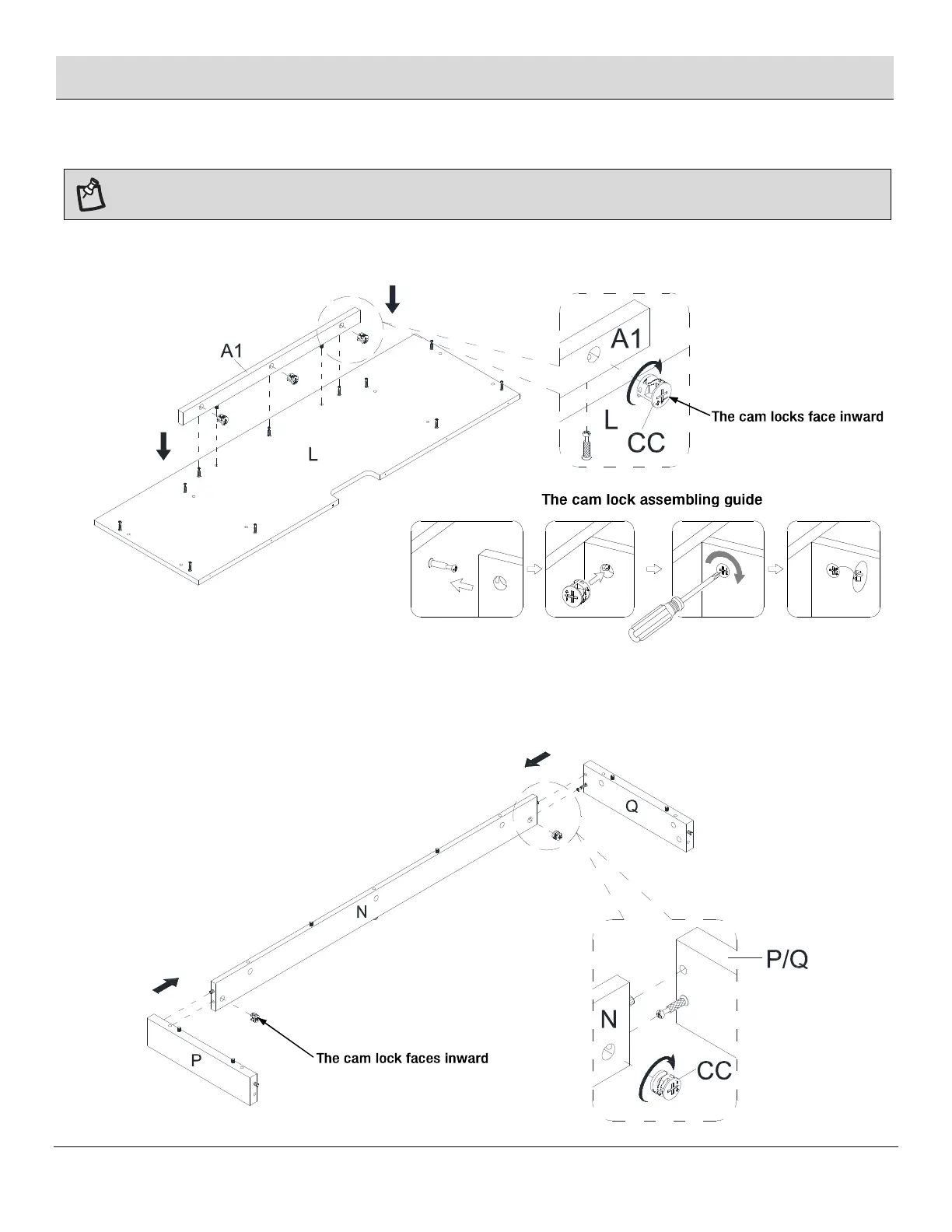 Refer to the cam lock assembling guide drawings in this step for further clarification on how to properly install cam locks. Apply this method