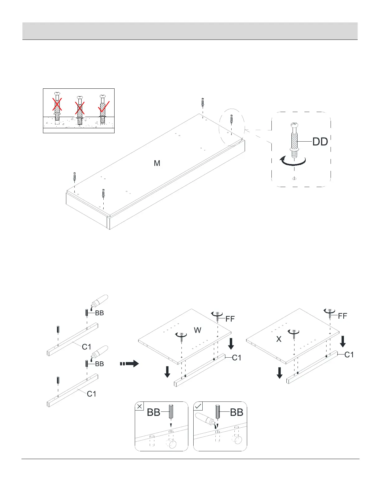 Securely screw four cam bolts (DD) into the designated small holes on the top of bottom panel (M) using a Phillips screwdriver.
