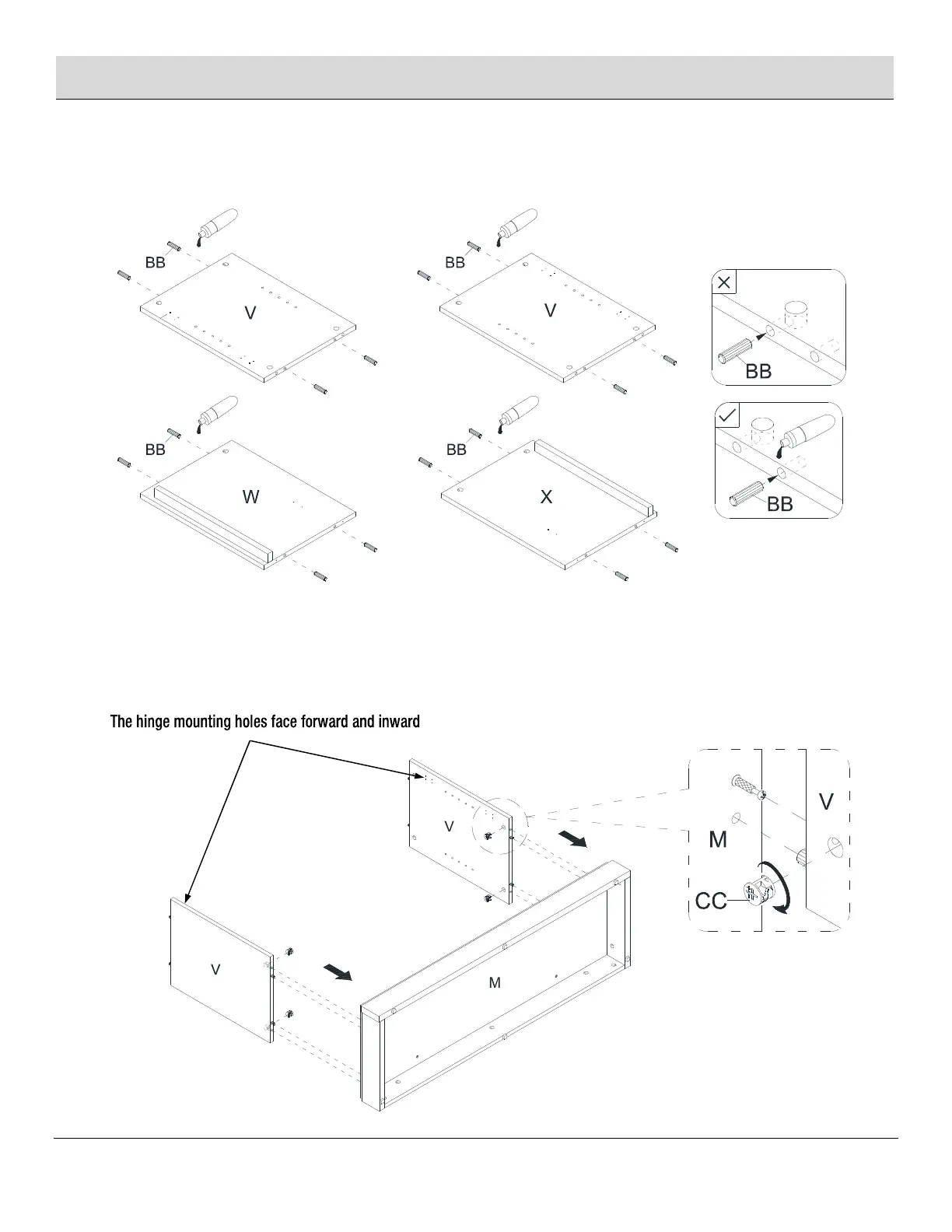 Align and attach both lower side panels (V) to the bottom panel (M) by engaging four cam locks (CC).