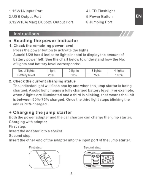 Suaoki U28 - Instructions - Power and Charging; Power Indicator and Charging Status; Charging the Jump Starter