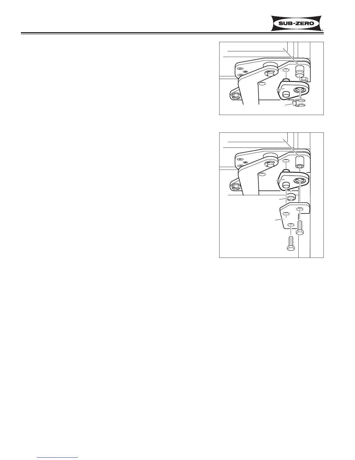 c. Reinstall bushing, stiffener plate and bolts onto lower cabinet hinge.