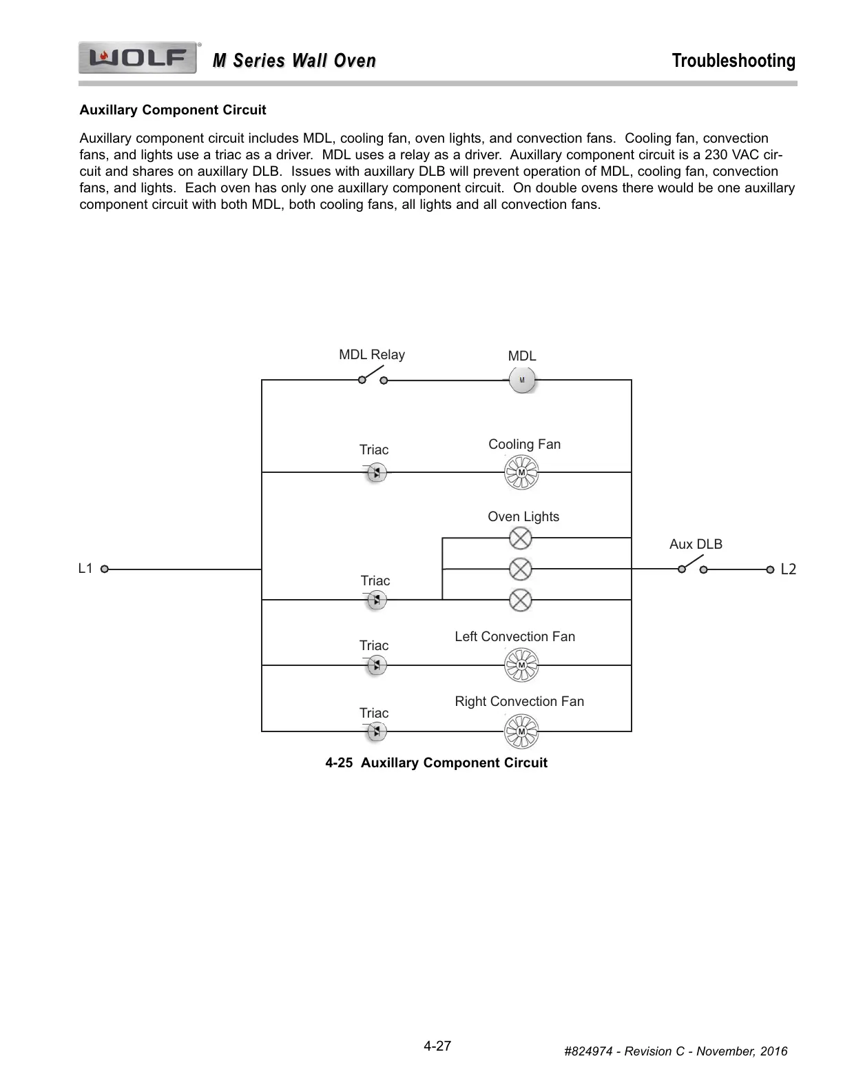 Auxillary component circuit includes MDL, cooling fan, oven lights, and convection fans. Cooling fan, convection