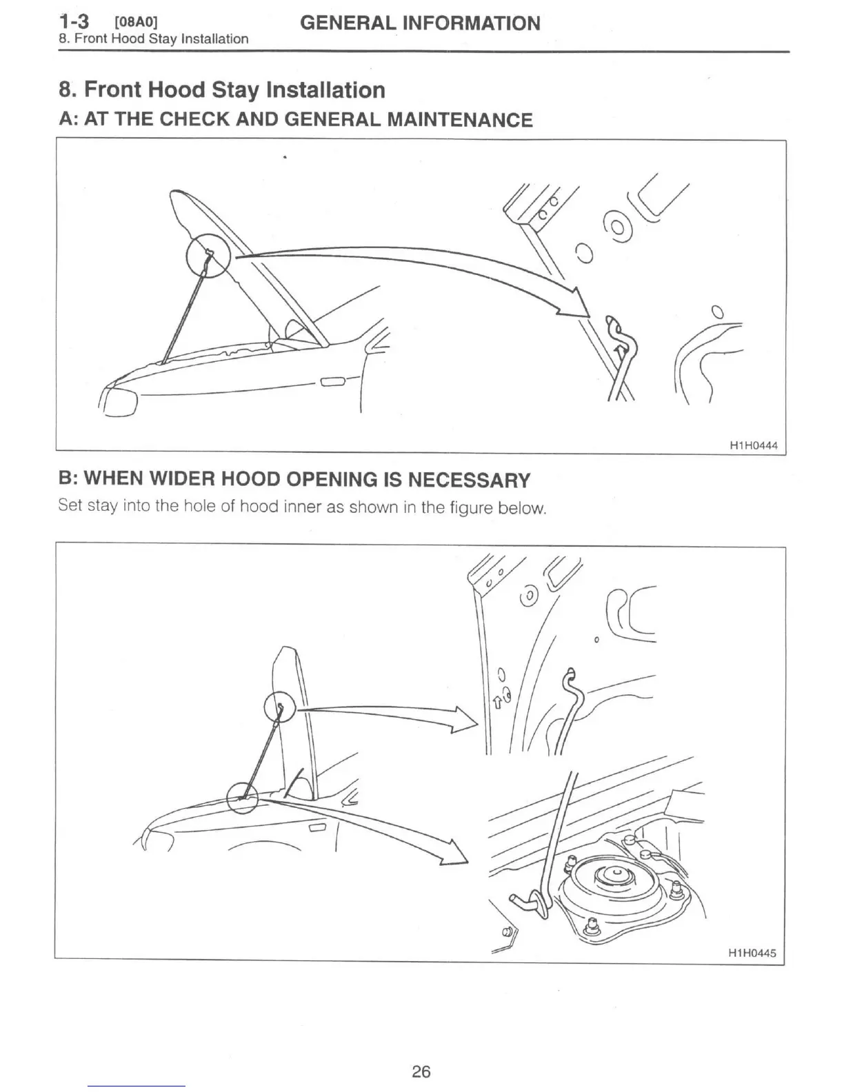 Subaru 1997 Impreza - Front Hood Stay Installation; At the Check and General Maintenance; When Wider Hood Opening Is Necessary