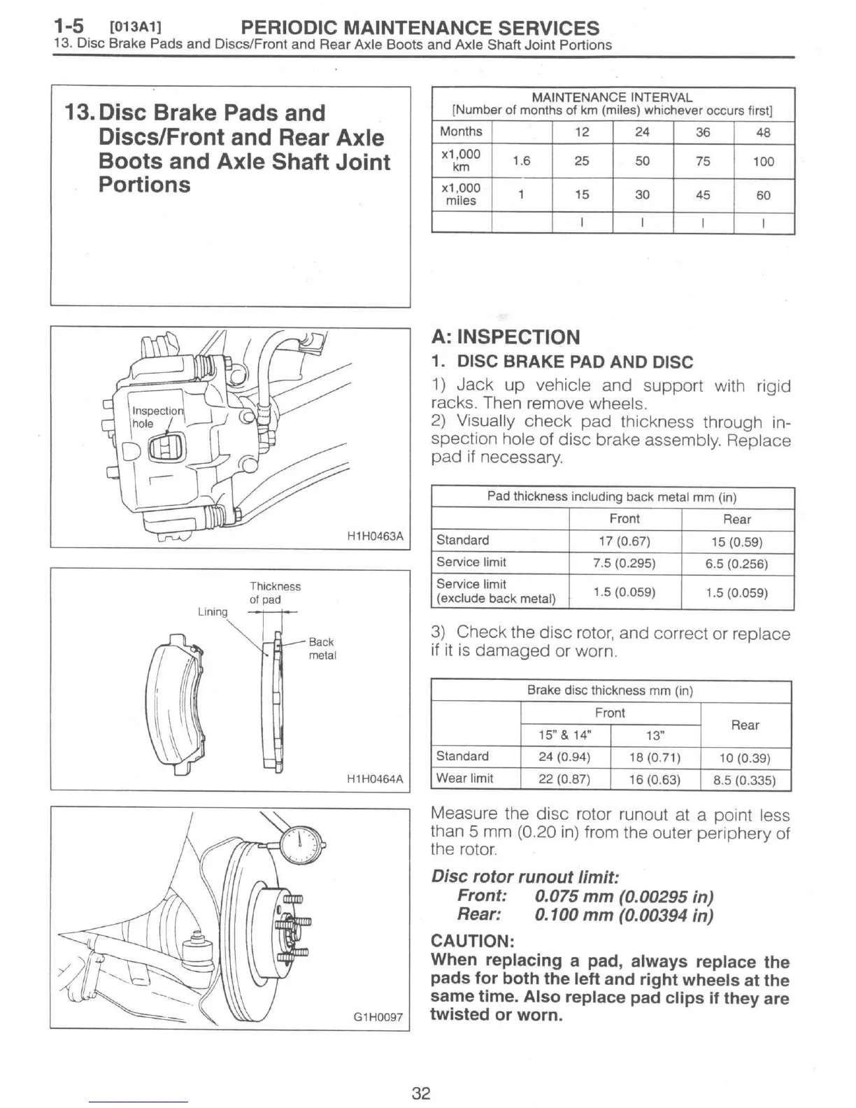 Subaru 1997 Impreza - Disc Brake Pads and Discs;Front and Rear Axle Boots and Axle Shaft Joint Portions; Disc Brake Pad and Disc Inspection