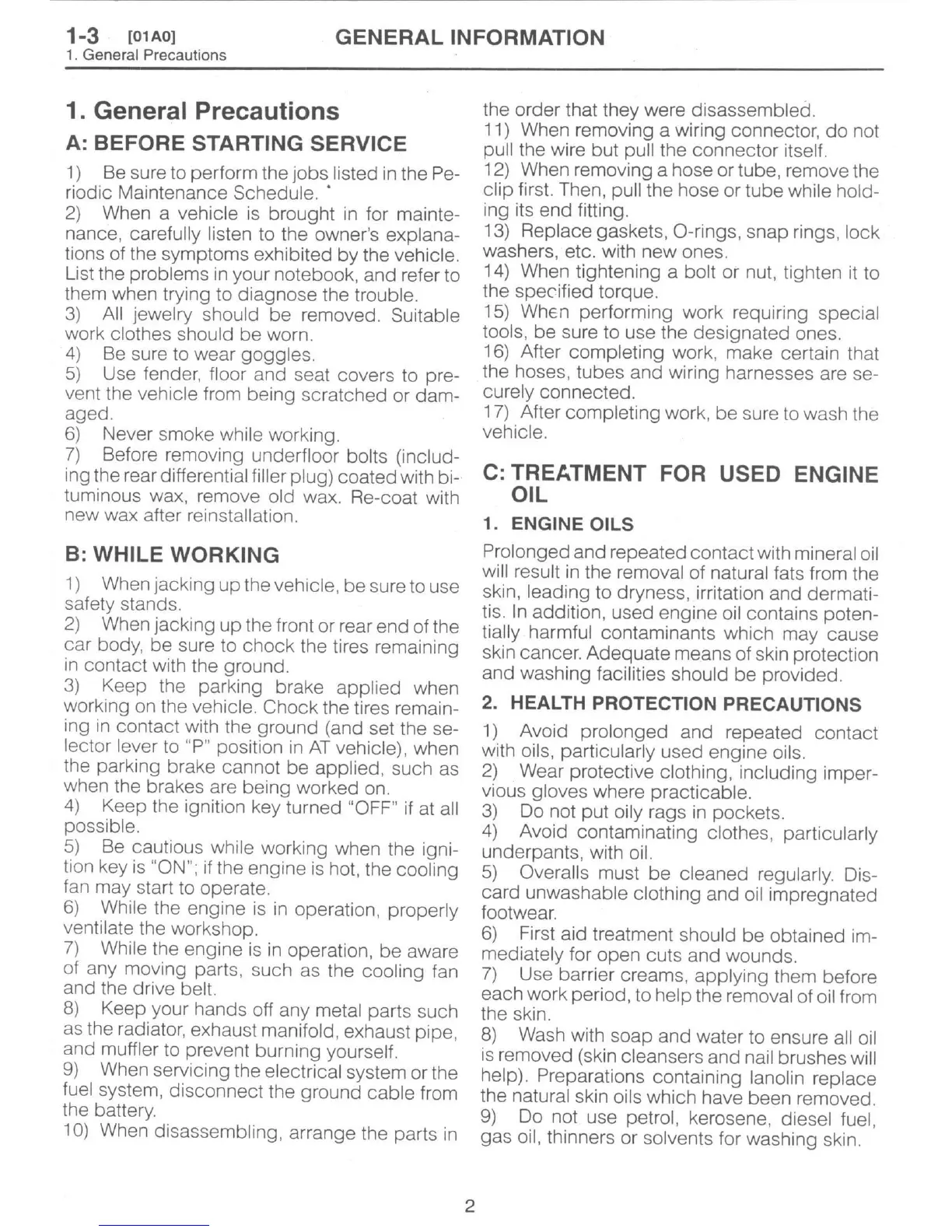 Subaru 1997 Impreza - General Precautions; Before Starting Service; While Working; Treatment for Used Engine Oil