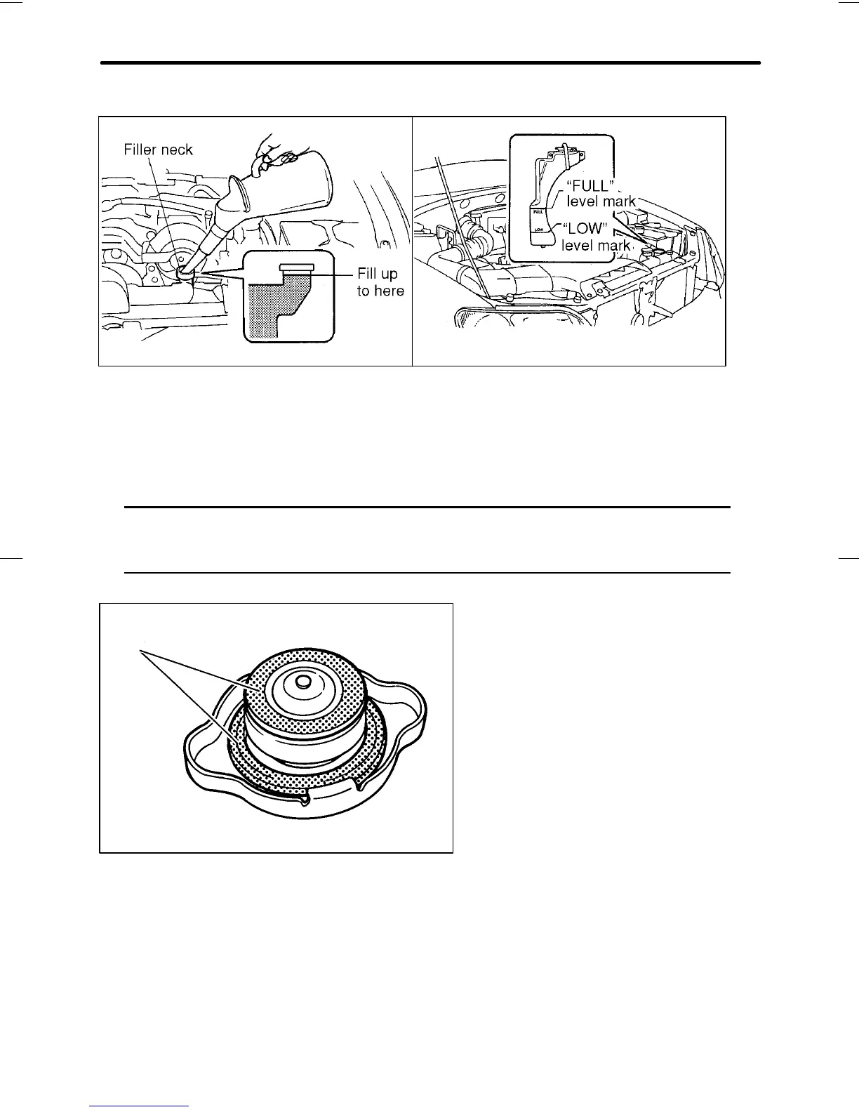 reserve tank’s “FULL” level mark. Do not pour the coolant too quickly,