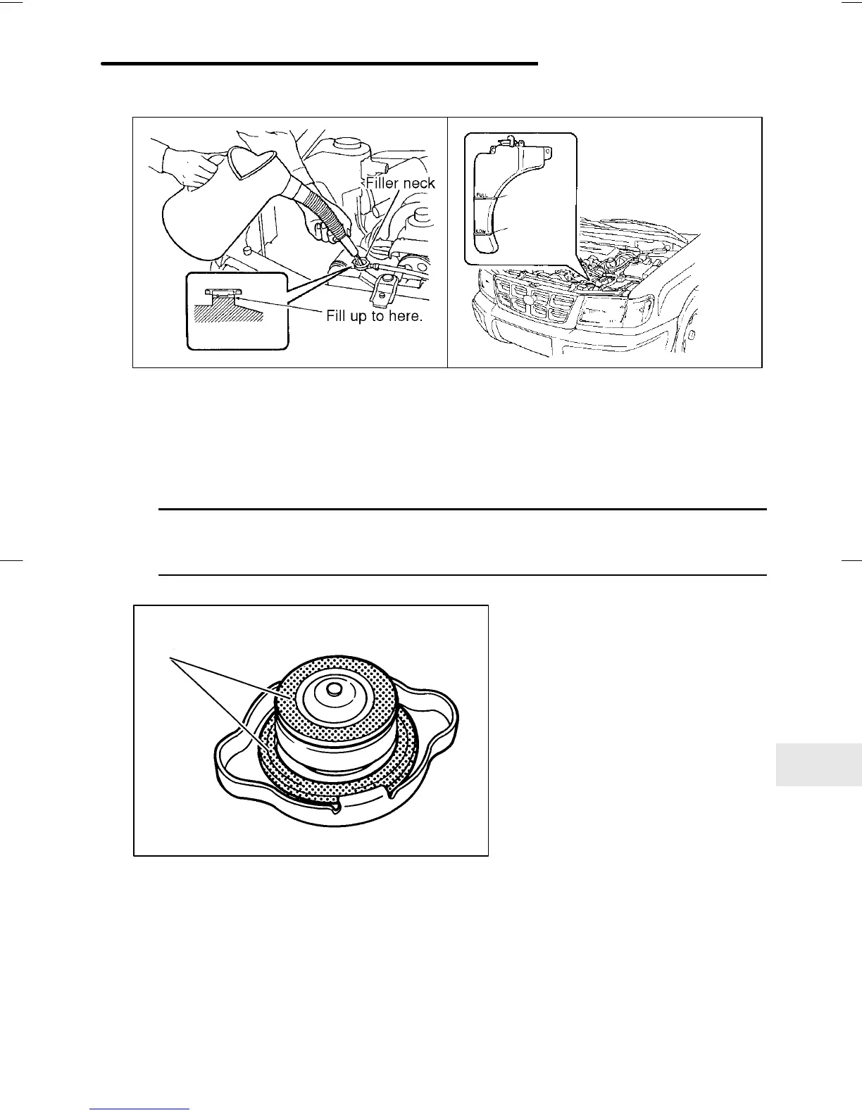 reserve tank’s “FULL” level mark. Do not pour the coolant too quickly,