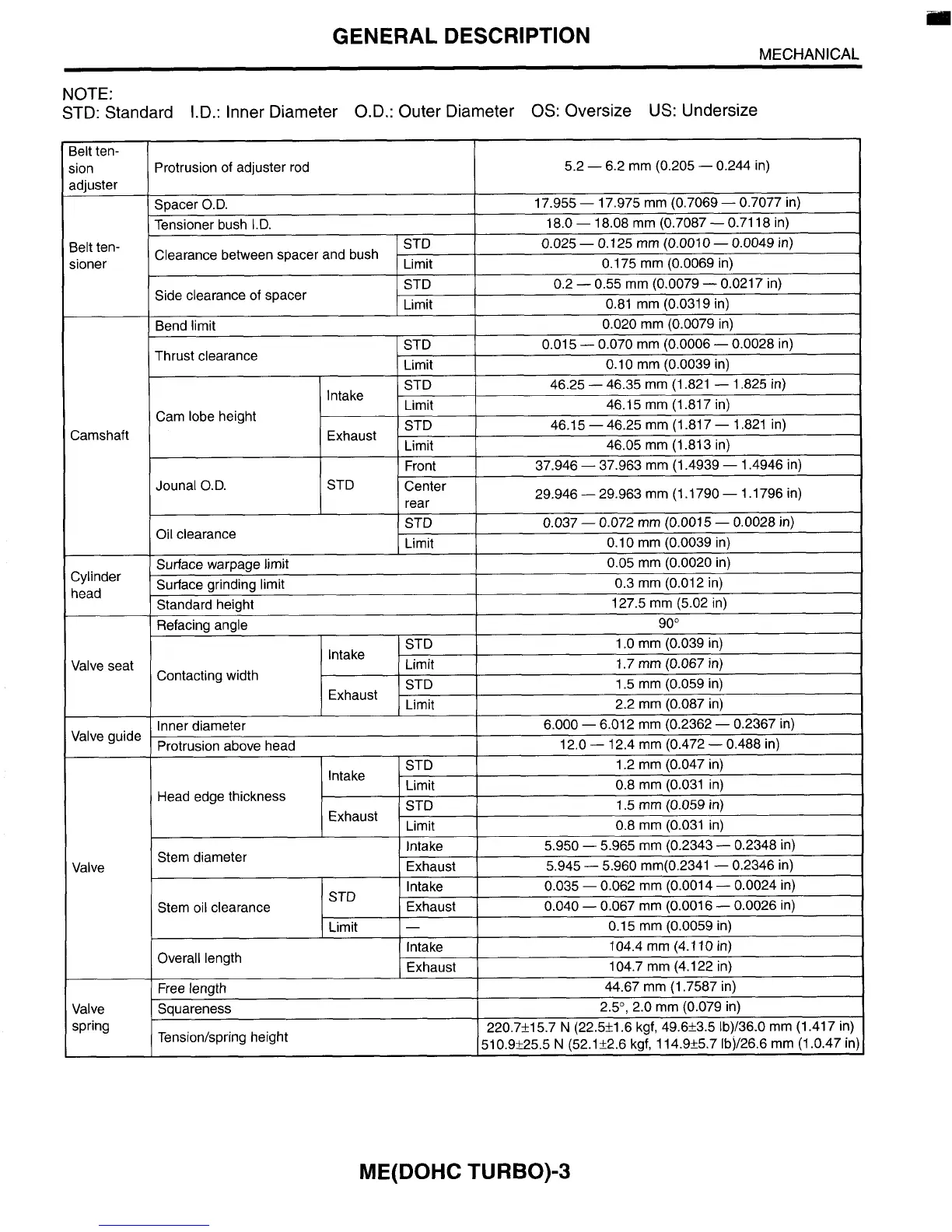 Inner Diameter O.D.: Outer Diameter OS: Oversize US: Undersize