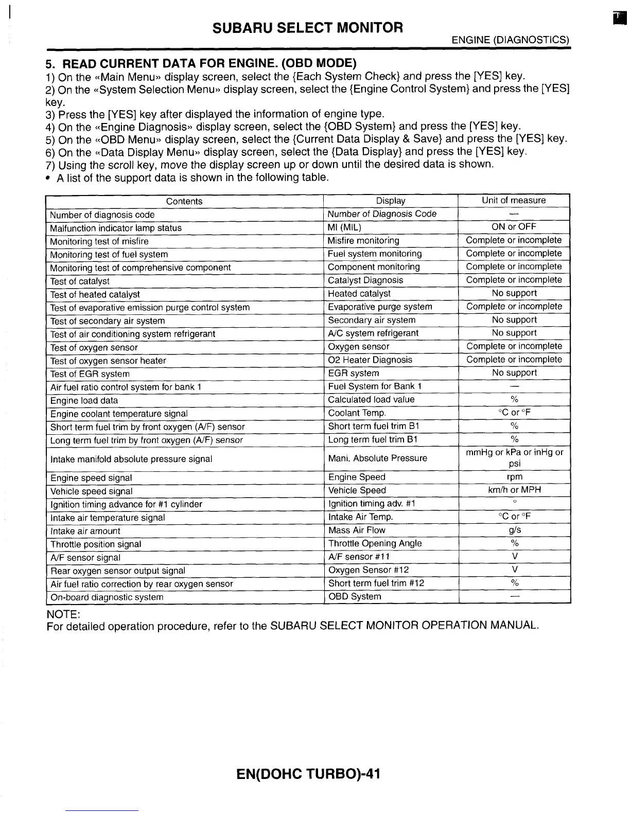 the SUBARU SELECT MONITOR OPERATION MANUAL.